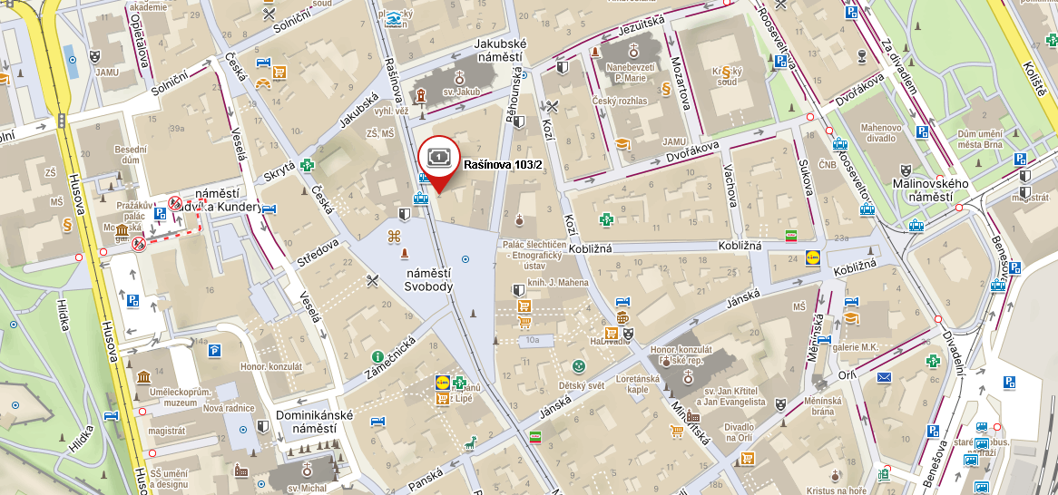 Naše školící centrum se nachází v centru Brna s výbornou dostupností MHD. V okolí najdete několik možností placeného parkování – doporučujeme garáže Janáčkovo divadlo, parkování Velký Špalíček či hotel International nebo parkovací zóny na ul. Rooseveltova a Koliště.
