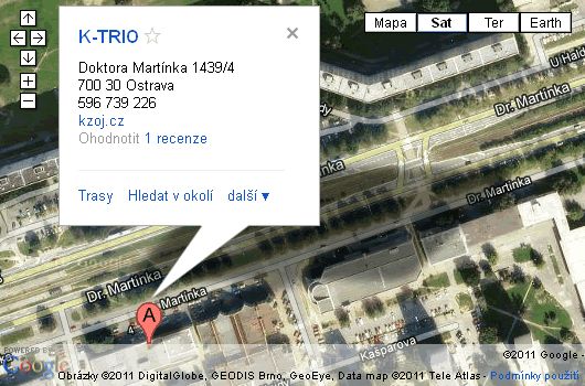 Z hlavního vlakového nebo autobusového nádraží: tramvají č. 1, vystoupit na zastávce Dr. Martínka (cesta cca 25 minut) - po levé straně okrová budova - K-TRIO Z vlakového nádraží Ostrava-Svinov: tramvají č. 17, vystoupit na zastávce Kotase - Rondl, přestup na tramvaj č. 1 směr centrum, vysoupit na zastávce Dr. Martínka (1 zastávka) - po pravé straně okrová budova - K-TRIO.