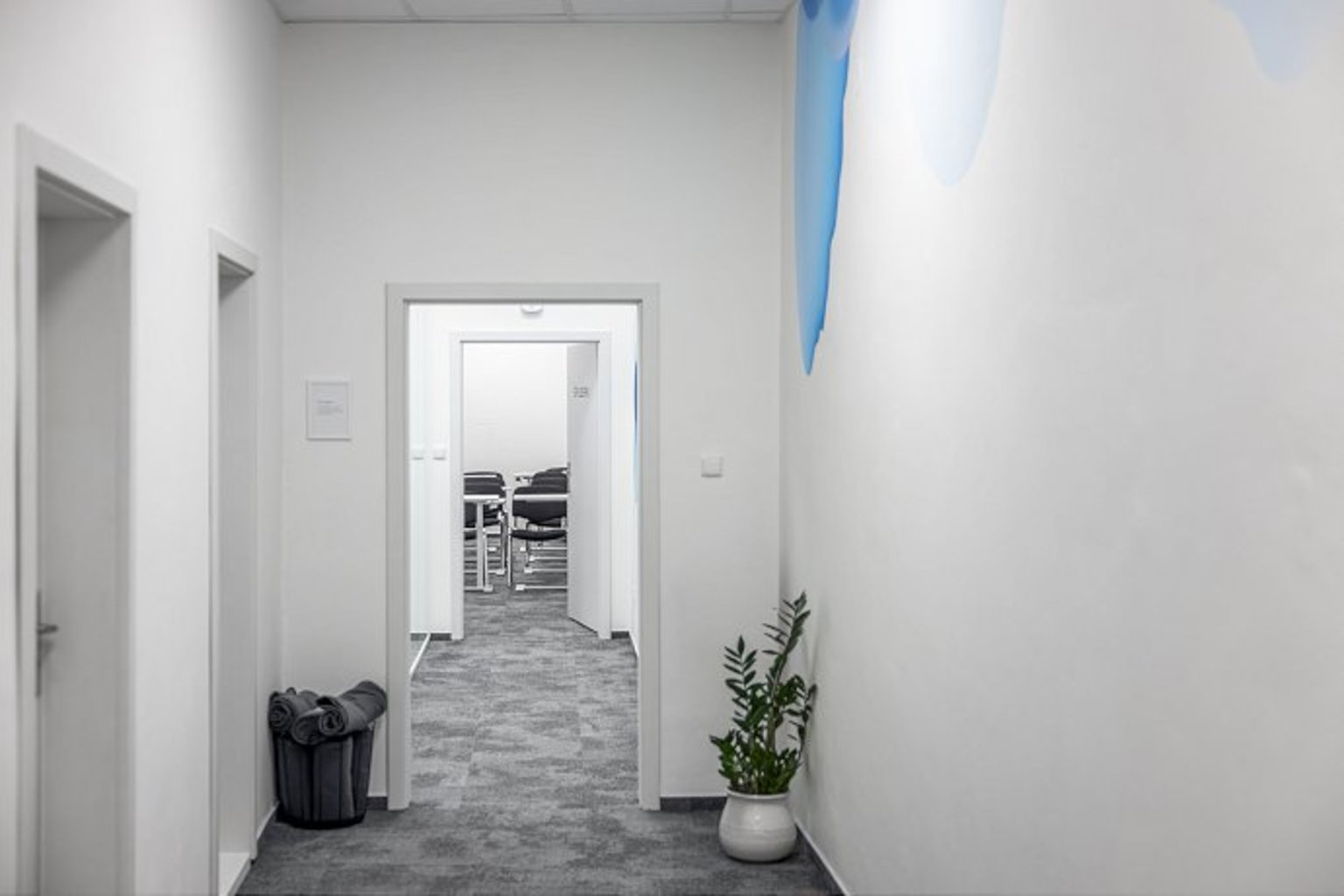 Moderní vybavení – pohodlné židle, gymnastické míče na sezení, výškově nastavitelné stoly, Wi-Fi, flipchart, denní světlo, k zapůjčení deky, nabíječky